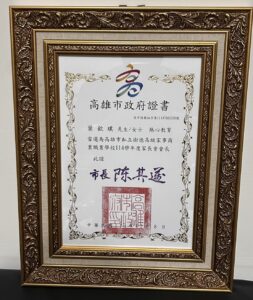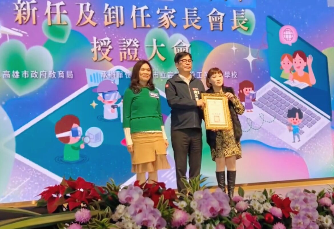 活動中,市長陳其邁特別頒發證書予高雄市私立樹德高級家事商業職業學校新任家長會會長葉欽琪女士,肯定其熱心教育、長期投入校務及親師社群協力之貢獻。授證儀式後,陳市長與葉欽琪女士合影留念,場面溫馨隆重。