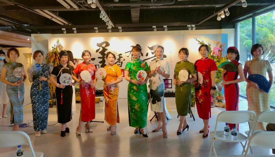 創會長林意雯,穿著由張明琴老師繪製橘色牡丹花卉旗袍。副秘書長張愷庭則穿上水墨畫名家田金生老師親自畫的荷花圖案的旗袍,前會長黃瀟、活動長王智瑩、財務長羅家明也穿上由名家繪製的旗袍,展現藝術的流動感。蒂思綠珠寶執行長林意雯與幾位旗袍美人佩戴由蒂思綠珠寶提供的珠寶項鍊走秀,襯托出優雅、風華絕代的佳人姿態。各種顏色的旗袍及花卉圖案充分展現古典美,精彩絕倫的旗袍秀贏得了在場觀眾的矚目,令現場氣氛達到最高點。