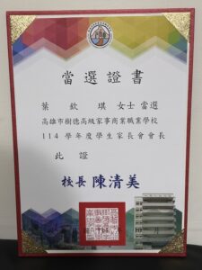 【記者林政良/高雄報導】高雄市樹德家商於今天10月9日舉行114學年度學生家長委員會會議,葉欽琪女士順利蟬聯家長會會長。